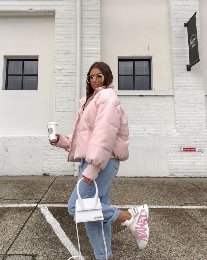 эко-кожи;замши;бархата;плащевки.Она шикарно смотрится в образах с трикотажной юбкой или платьем, со спортивными костюмами. Под эти луки подойдут кроссовки или ботинки, каблуки будут смотреться немного неуместно.