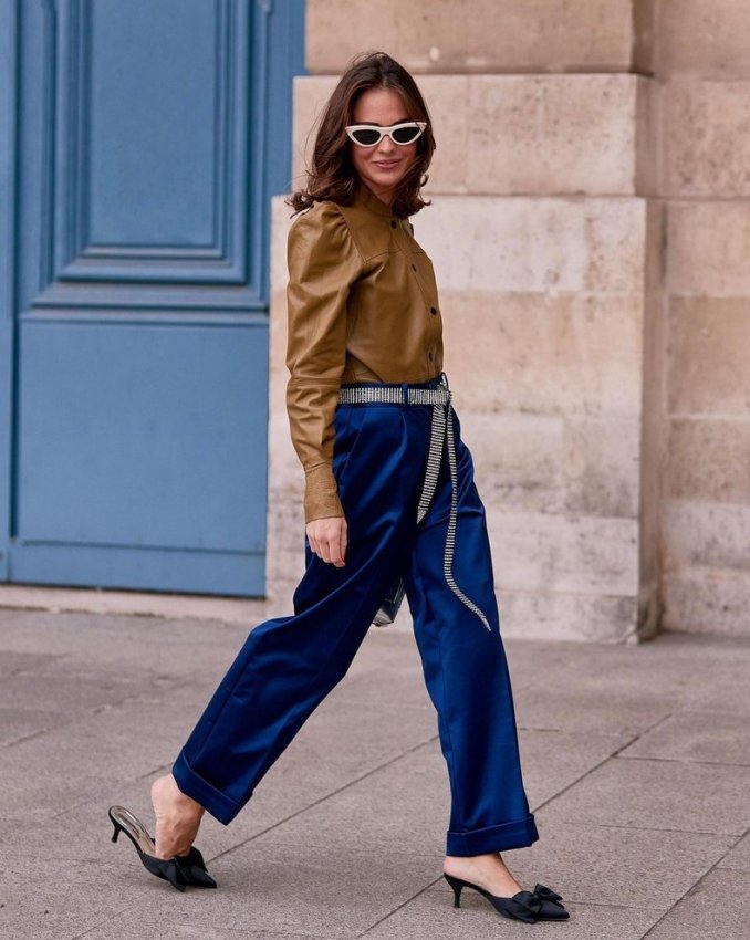высокая посадка;брюки-бананки;брюки клеш;палаццо.Сочетать кожаные брюки с обувью проще простого, они подойдут под: сапоги, ботфорты, ботильоны и кроссовки.