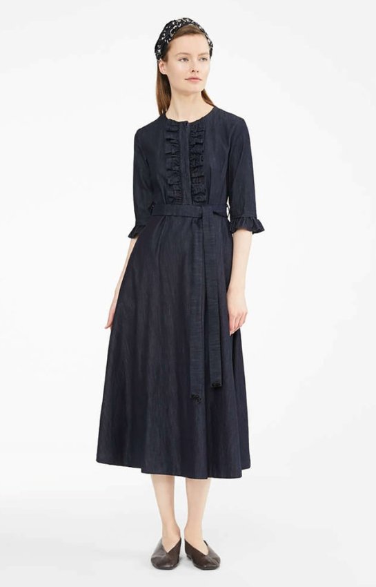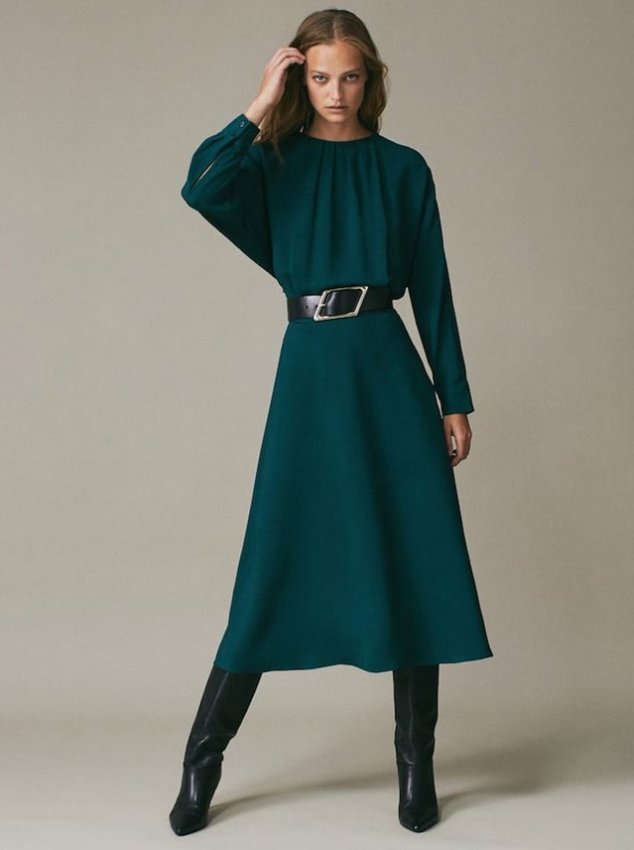 цветовой гаммы 2020, он может быть довольно светлым или густым и насыщенным (как здесь). Платье имеет расклешенную юбку миди, длинные рукава на манжетах, декольте отсутствует. Его главный акцент — мягкие складки на лифе, образующие вертикальную драпировку. Черный пояс с пряжкой подчеркивает стиль. Кстати, закрытые платья очень эффектно выглядят с высокими сапогами, придавая образу загадочность и соблазнительность.