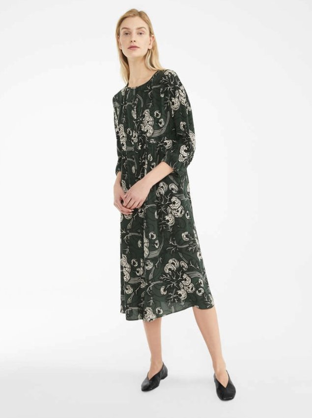 Принт, который вы видите ниже, не относится к «бабушкиным узорам». Но все-таки это платье можно отнести к сдержанному закрытому стилю. Длина, закрывающая колени, рукава три четверти, круглый вырез по шее, неброский утонченный принт — все детали этого стиля налицо.