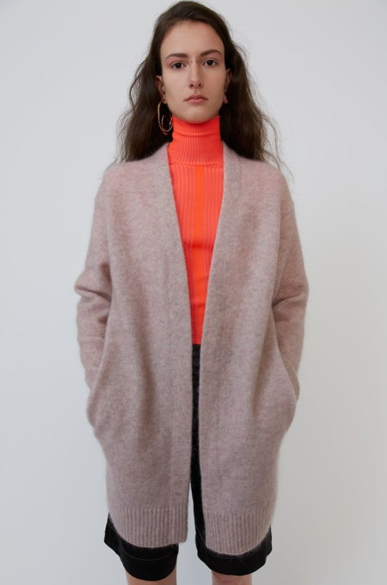 Существует риск, что длинный кардиган нейтрального цвета может выглядеть словно находка из бабушкиного сундука. Чтобы этого не допустить, стилизуйте вещь максимально смело: в лукбуке Acne Studios мы подсмотрели сочетание с неоновой водолазкой — получается крайне свежо.