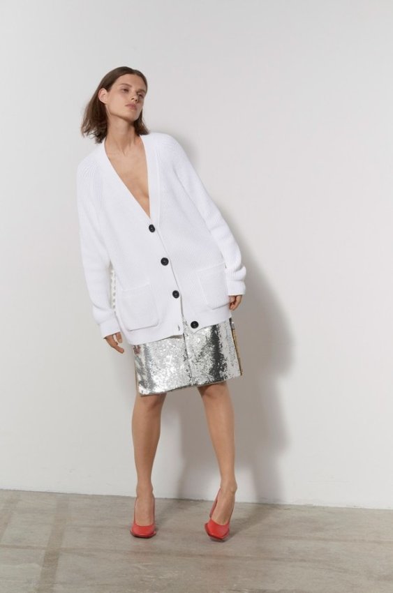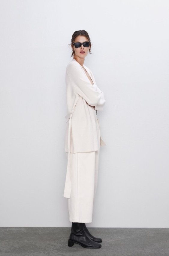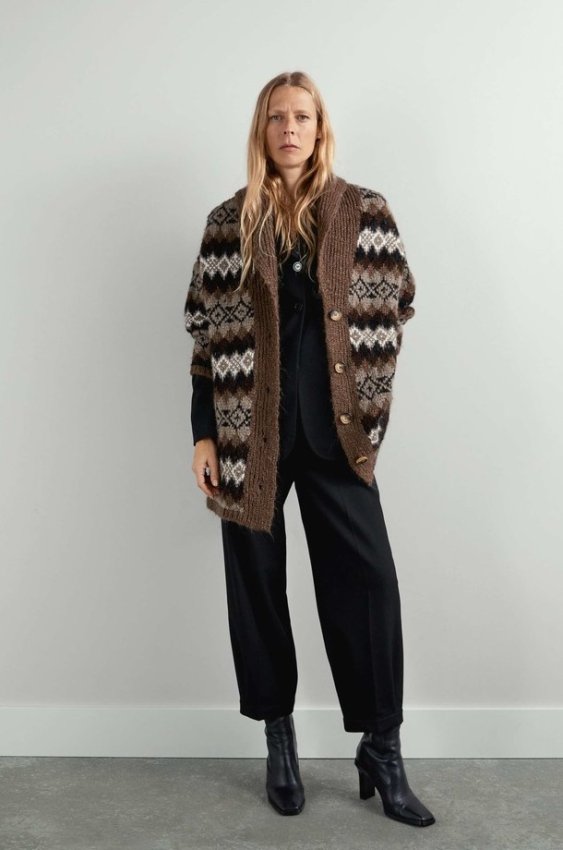 этническими мотивами будет круто смотреться на контрасте с современными силуэтами и фактурами: подойдут, например, широкие брюки. Впрочем, лично мы планируем накидывать кардиган прямо на костюм, ориентируясь на снимок из свежего каталога Zara.