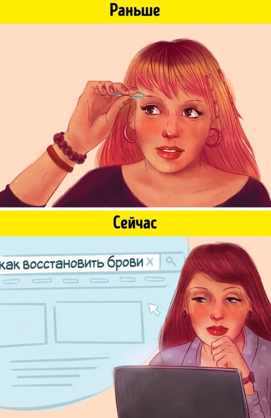 Чуть позже в моду вошли более выразительные и густые брови. Женщины начали воскрешать то, что когда-то выдирали с корнем. Я похвалила себя за нежелание орудовать пинцетом раньше и сделала вывод: