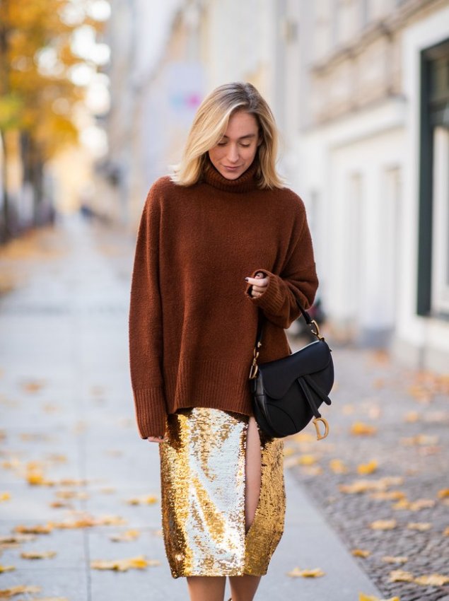 Если вам кажется, что блестящая юбка — не лучший вариант для офиса, то мы готовы доказать обратное. Сочетание пайеток с шерстяным объемным свитером и ботильонами kitten heels выглядит вполне уместно и при этом эффектно.