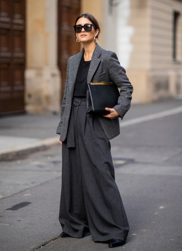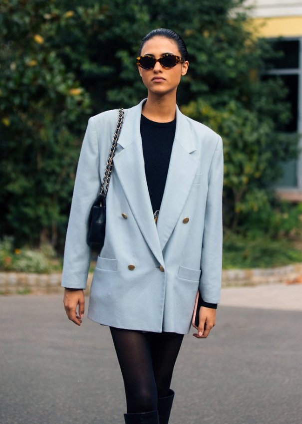 Главный мастхэв сезона — объемный жакет с мужского плеча, который отлично смотрится и с элегантными платьями, и с кожаными брюками. Последнее сочетание нам нравится особенно сильно. Рекомендуем дополнить образ водолазкой с металлическим блеском и трендовыми казаками.