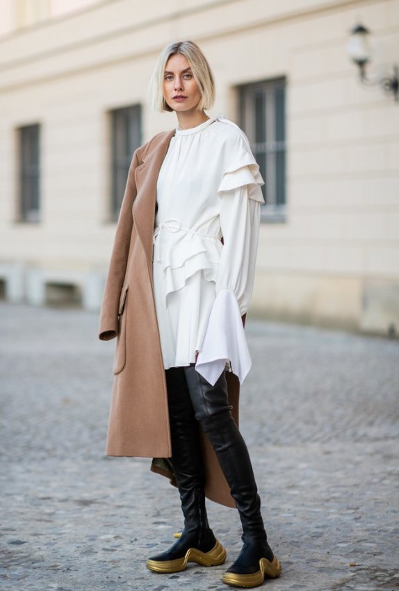 Забудьте о сдержанных платьях-футлярах и отдайте предпочтение длинным белоснежным рубашкам. Лучше всего они будут смотреться с кожаными или замшевыми ботфортами и крупными серьгами-люстрами.