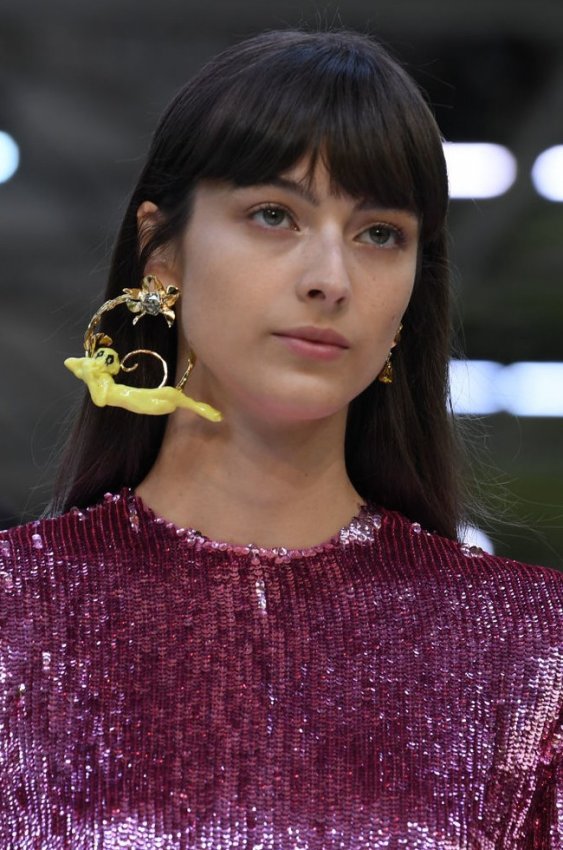 серьги из золота, амулеты, глиттер на глазах моделей, солнцезащитные очки в неоновой полупрозрачной оправе.