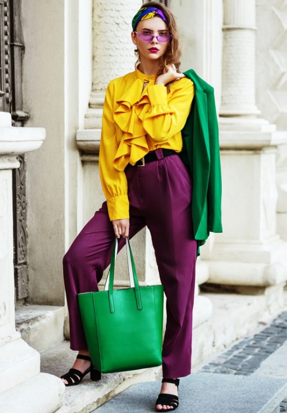 Я уверена, что многие из вас знакомы с этим вариантом. Но не все знают, что оно самое контрастное и агрессивное. Это сочетание противоположных цветов в круге Иттена. Например, зеленый и красный, желтый и фиолетовый. Я довольно часто вижу, что девушки используют его для романтического стиля. Но психологически оно к романтике не имеет никакого отношения, поэтому будьте внимательны. При использовании комплементарного сочетания обращайте внимание на свою внешность. Если она контрастная, смело берите насыщенные оттенки, если нет — отдайте предпочтение светлым. Так образ будет выглядеть гармоничнее.
