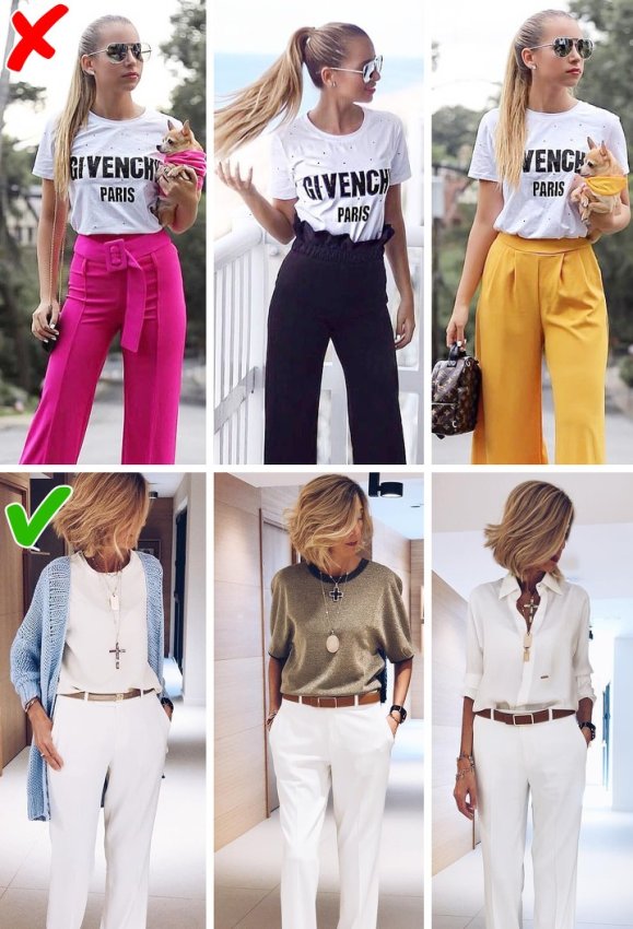 Главное правило рационального гардероба гласит: больше вариантов верха к одной юбке или одним брюкам. Именно верх, не низ, создает ощущение нового комплекта. Если вы будете носить одну и ту же кофточку, при этом меняя юбки и брюки, для окружающих вы будете выглядеть как человек, который ходит в одном и том же. Но если к одним и тем же брюкам надевать разные варианты верха, то каждый раз это будет выглядеть как новый комплект, вы будете разной, при этом не придется тратить лишние деньги на покупку нужной пары к очередной блузе.
