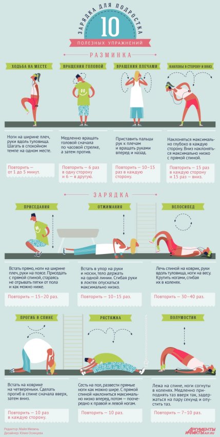 Особенно полезна зарядка для подростков, чьё тело активно растёт, но при этом они ведут преимущественно сидячий образ жизни. Регулярная посильная физическая нагрузка поможет предупредить множество проблем со здоровьем, избежать болей в спине и формирования неправильной осанки.