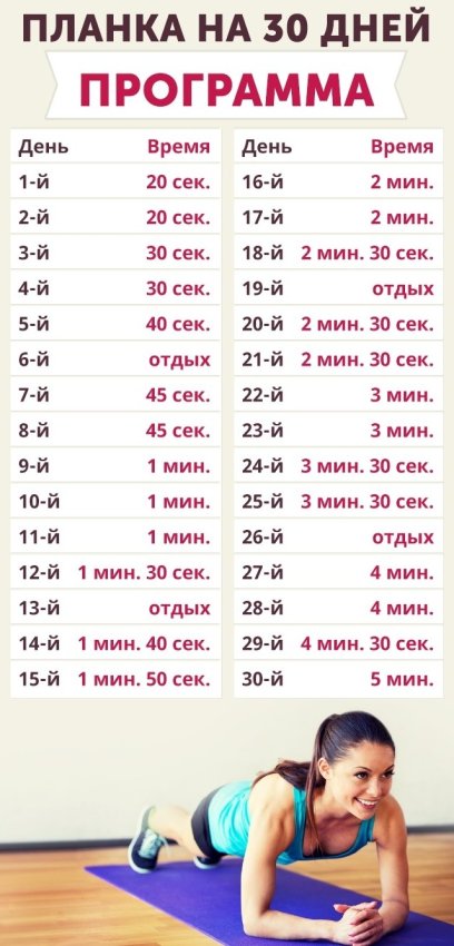 Задача состоит в том, чтобы выполнять 1 упражнение в день в течение определенного количества времени — от 20 секунд в 1-й день до 5 минут в 30-й день.