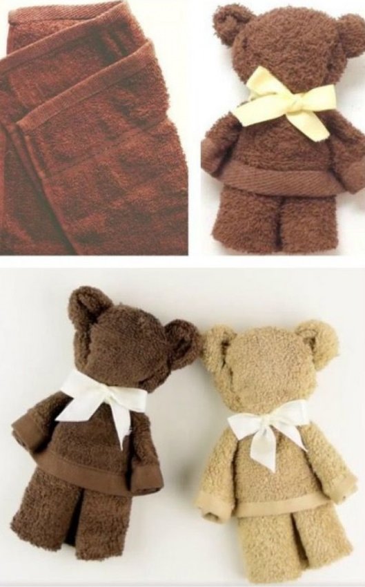 Новое полотенце всегда пригодится в хозяйстве. А чтобы придать подарку более интересный вид, попробуйте свернуть его в виде мишки