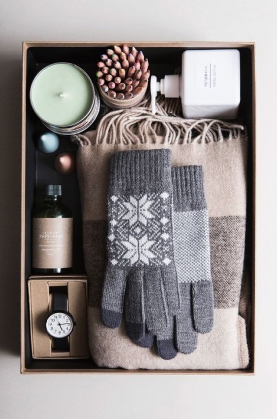 Сформируйте персональный зимний набор с самыми необходимыми вещами. Помните, что ваш подарок не обязательно должен стоить баснословных денег: парочки мандаринов и набора специй для глинтвейна вместе с красивым шарфиком будет достаточно, чтобы согреть любое сердце.