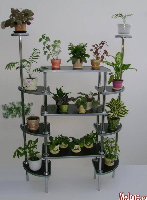 Очень удобное приспособление для расстановки горшков с комнатными цветами – многоярусные этажерки. Обычно их ставят неподалеку от окна в любом свободном пространстве комнаты.