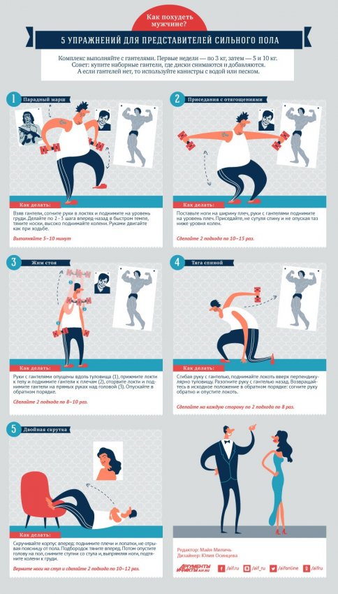 Предлагаемый комплекс выполняйте с гантелями. Первые недели – по 5 кг, затем постепенно переходите на 7, 10, 12 и 15 кг. Чтобы не покупать несколько пар, можно приобрести наборные гантели, где диски снимаются и добавляются. За неимением гантелей можно использовать канистры с водой или песком.
