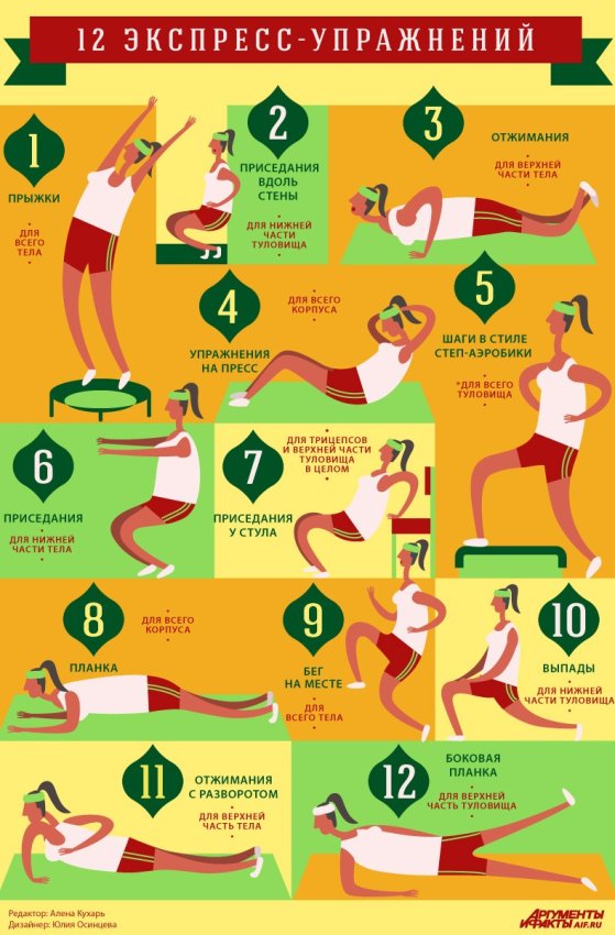 Добиться идеальных форм поможет комплекс из 12 упражнений, в основе которого — краткость и интенсивность. На каждое упражнение нужно тратить не более 60 секунд, и, таким образом, на выполнение всего комплекса уйдёт около 7 минут.