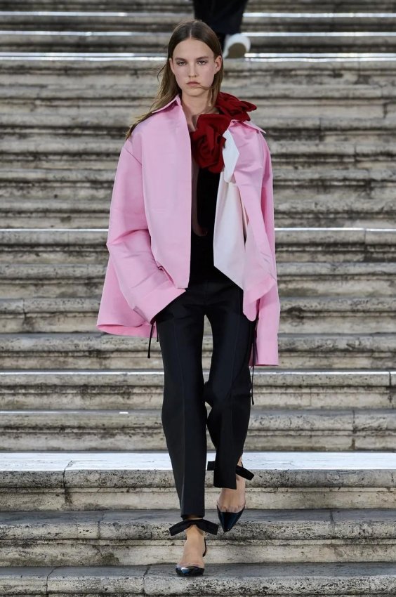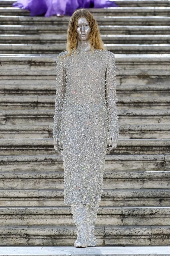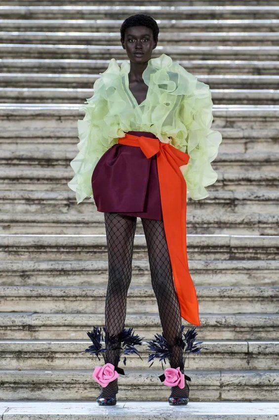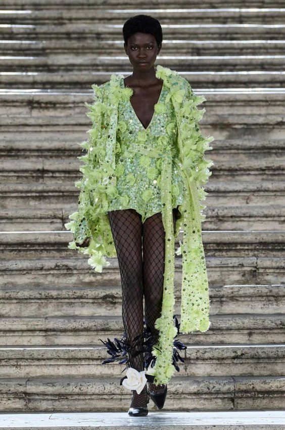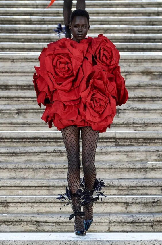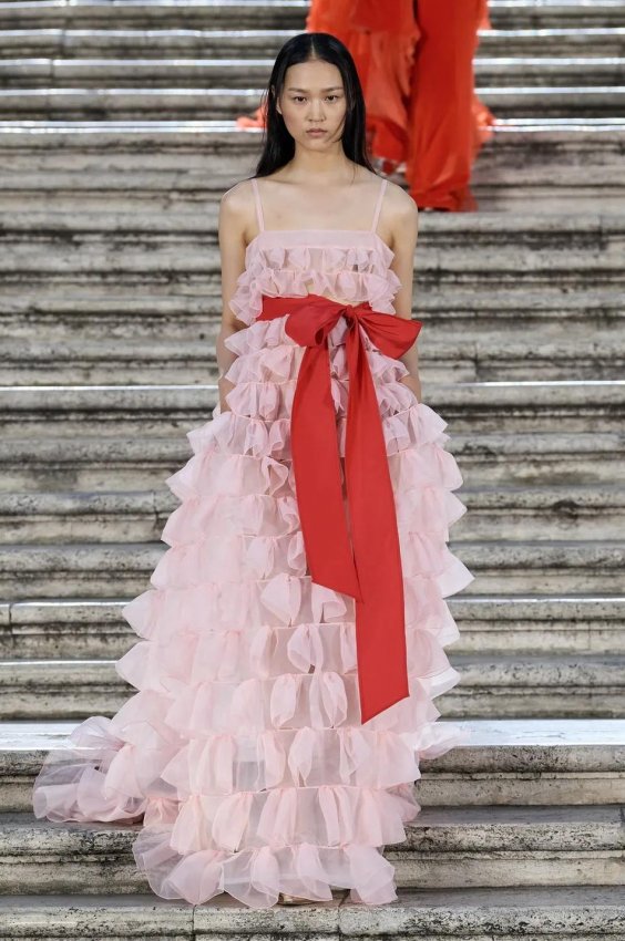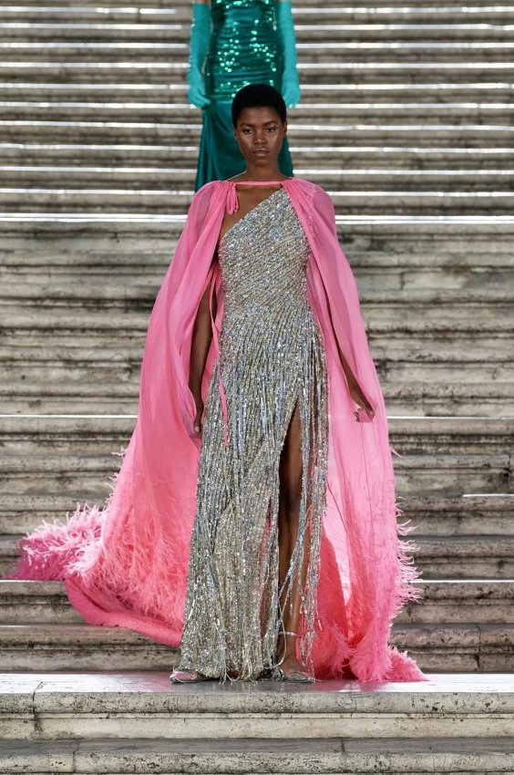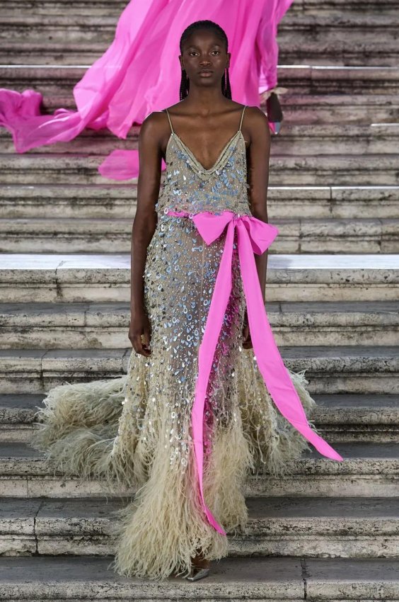 Прошлым вечером в Париже свою новую кутюрную коллекцию для Valentino представил Пьерпаоло Пиччоли — она получила название The Beginning. В этом сезоне дизайнер вновь активно работает с цветами: в прямом и переносном смысле. На подиуме мы увидели буйство ярких красок, а также отсылки к образам живых цветов: модели выходили на подиум в головных уборах-бутонах. Что касается оттенков, то тут Пиччоли показал богатую палитру, которая плавно сменялась вместе с настроением: в начале пышные платья, накидки и костюмы были окрашены в алый, затем появился уже фирменный розовый, который сменился на фиолетовый, кислотно-зелёный и оранжевый. «Отдыхом» от красок стали прозрачные платья и топы серебристого цвета: сияние — ещё один большой тренд коллекции.
