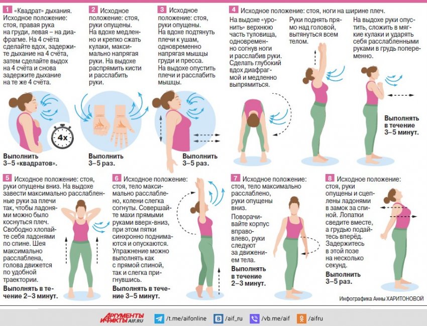 Стресс вызывает напряжение в теле, а физическое напряжение «подпитывает» нервное. Выйти из этого круга помогут упражнения на растяжку (они расслабляют мышцы, снимают зажимы, улучшают кровообращение и нормализуют дыхание) и так называемые простукивания, активизирующие лимфосистему. Более подвижная лимфосистема снижает тревожность и способствует позитивному восприятию действительности.