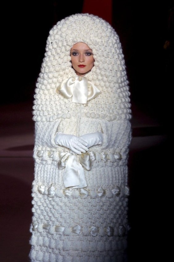 Французская модель и актриса Одри Марней во время весенне-летнего показа 2002 года произвела сенсацию — утонченной рыжеволосой красавице досталось, пожалуй, самое экстравагантное свадебное платье не только в истории бренда, но и в истории моды. Эту модель журналисты прозвали «матрешкой» — по факту, это был вязаный крючком кокон.
