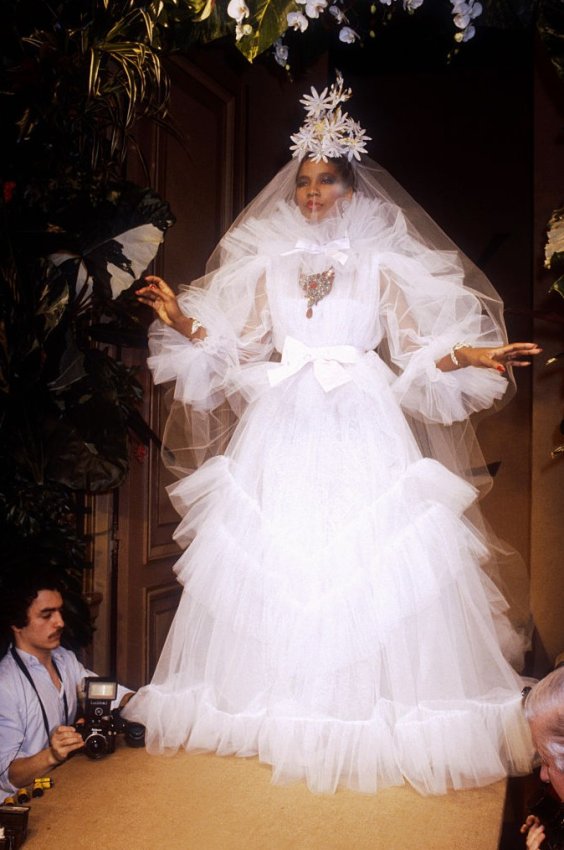 Незабываемый финал дефиле haute couture весна-лето 1983: свадебное платье, изготовленное из десятков слоев тюля. «Фишкой» образа и приметами эпохи стали впечатляющий головной убор из декоративных цветов и объемное ожерелье.