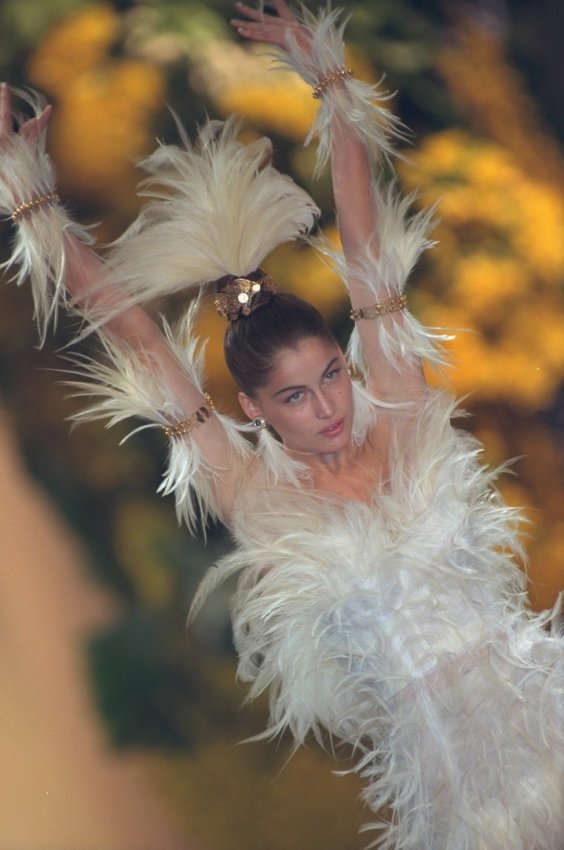 Сезон весна-лето 2000, и вновь Летиция Каста, которая на этот раз трансформировалась из богини лесной в птицу-феникс в платье из тюля с перьями.