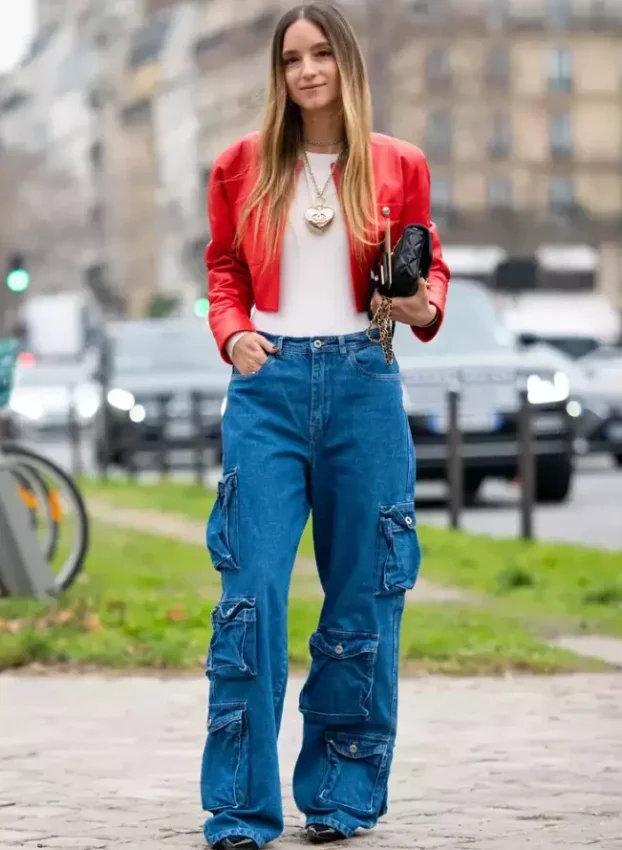 Если вы не решаетесь носить одежду, которая преувеличивает ваши формы, вы все равно можете попасть в тренд брюк-карго. Укороченная куртка из тонкой кожи или денима уравновесит визуальную тяжесть брюк-карго. Ищите куртку чуть выше естественной линии талии, чтобы создать стройный силуэт.