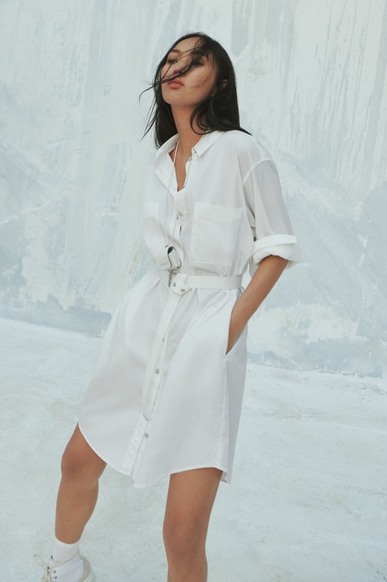 Первый образ состоит из лаконичного платья-рубашки, которое не требует никаких аксессуаров, кроме кожаного ремня и маленькой сумочки на шею для наушников и любимой помады. Для второго образа стилисты выбрали свитер тонкой вязки в сочетании с белыми джинсами. Аксессуары — бейсболка, ботинки и сумка-хобо — гармонично дополняют расслабленный образ.