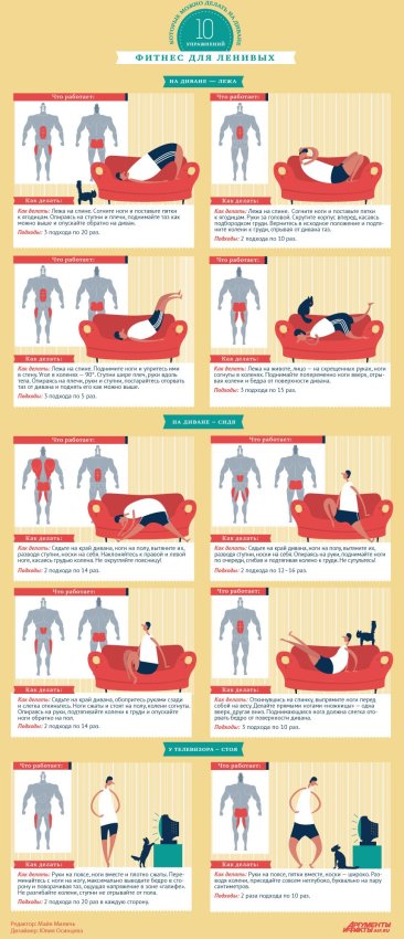 Лежать на диване и смотреть телевизор — что может быть вреднее для фигуры? Но отдыхать и валяться тоже полезно. Совместить фитнес и отдых можно, если превратить диван в полноценный спортивный снаряд. Ведь лёжа или сидя на нём можно делать не менее эффективные упражнения, при этом не отрываясь от просмотра интересной телепередачи или хорошего фильма.